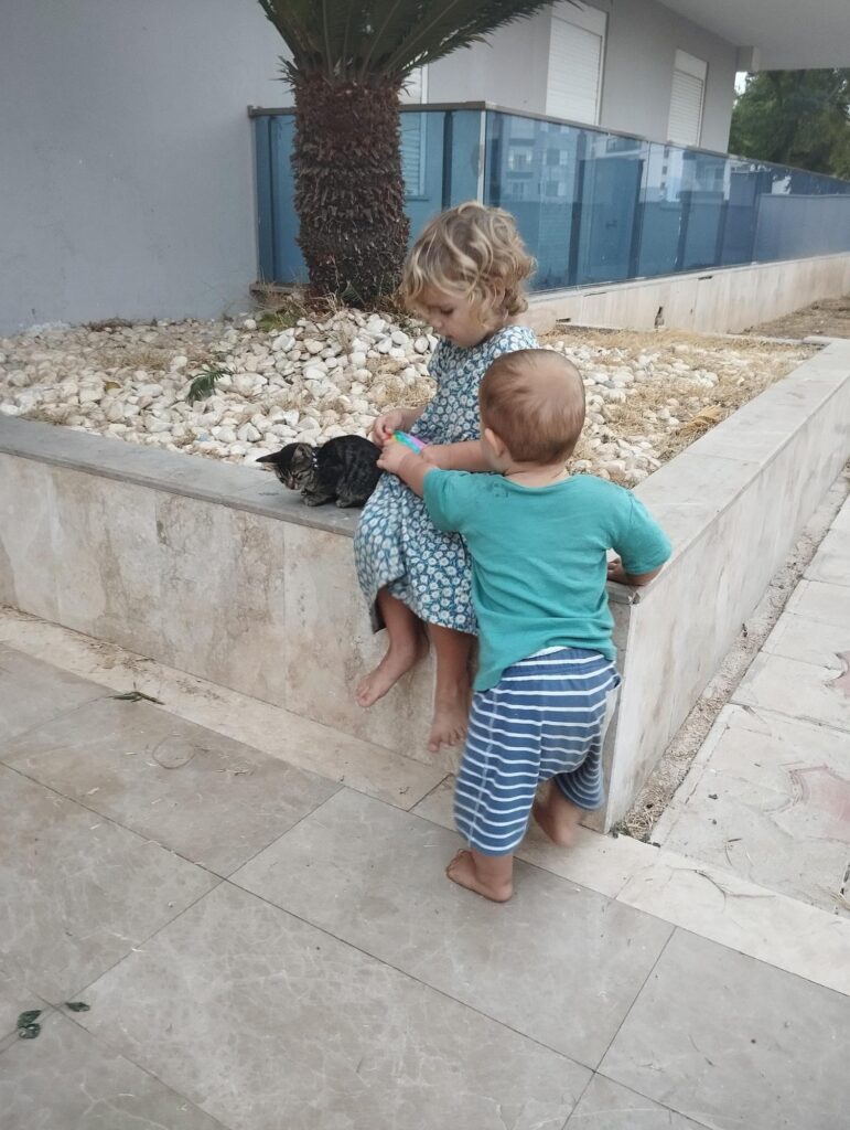 Vor einer Woche haben die Nachbarskinder von irgendwoher eine Babykatze abgeschleppt, die jetzt auf unserem Gelände lebt. Sie ist tatsächlich noch sehr klein und nicht in der Lage, selbstständig die Mauer zu überwinden. Die Kinder der Nachbarn kümmern sich tatsächlich, sie bekommt zu trinken und immer wieder etwas zu essen, außerdem hat sie ein Häuschen aus einem Karton bekommen.