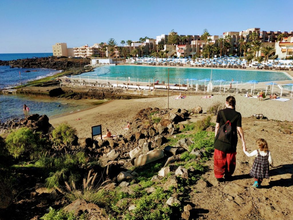Das Meer ist nicht so leicht zugänglich in Costa del Silencio. An den meisten Stellen durch zerklüftete Felsen von der Zivilisation getrennt kann man nur auf das Wasser runterblicken, aber nichts anfassen. An einer Stelle befinden sich Treppen und man kann runter zum Wasser. An einer anderen Stelle gibt es eine kleine schmale Bucht mit Sandstrand, ca. 10 Meter breit.