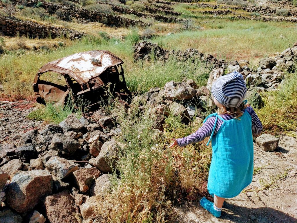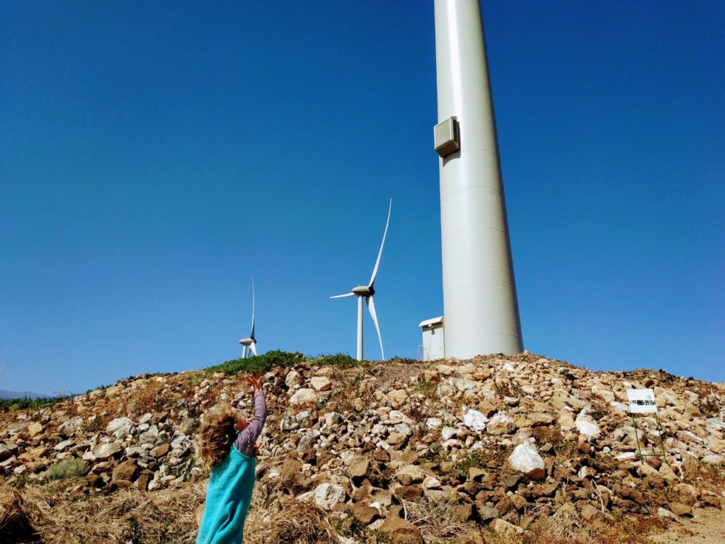 Wir haben die Windräder tatsächlich erreicht und direkt darunter eine Pause auf dem staubigen Boden gemacht, egal, es war trotzdem erholsam. Von unserem Haus aus kann man die Windgeräusche an den großen Flügeln oft hören, direkt darunter rauscht und saust es aber noch viel doller. Auserdem sind wir noch auf eine Ansammlung von Zwiebelfeldern gestoßen. Die Zwiebeln sind scheinbar so robust, dass sie den Wind aushalten und kein Gewächshaus brauchen. Warum sich am Wegesrand mitten im felsigen Gelände ein verrostetes Auto befand war schwer zu erklären, ich habe keine Ahnung wie es sich überhaupt dorthin bewegen konnte.