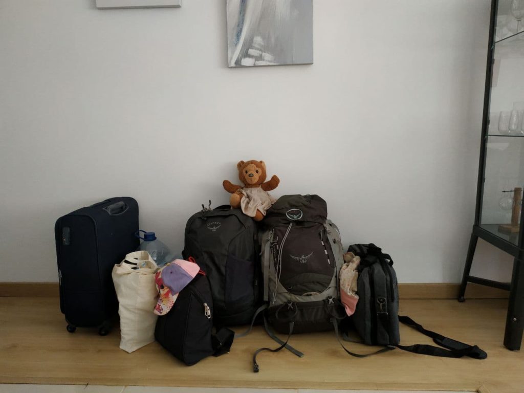 Wir reisen mit zwei Rucksäcken und einem Trolley, wo man insgesamt bei 18kg landet. Wenn wir jetzt alleine für die Hüllen unseres Hab und Gutes fast 6kg abzieht sind wir noch bei 12kg. Gewichtstechnisch gibt es dann noch die Möglichkeit das „personal item“ und die Laptoptasche mit schweren Dingen zu bestücken. Wobei es natürlich immer Grenzen gibt, schließlich dürfen ja auch die Maße der einzelnen Stücke eine bestimmte Größe nicht überschreiten, ganz abgesehen davon, dass wir das ja alles auch noch tragen müssen.