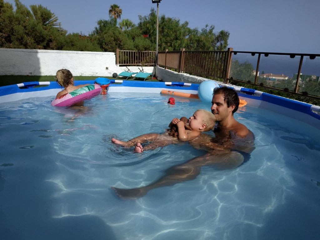 Eines Tages hatten wir einen Glückstag, denn unsere Nachbarin war am Nachmittag gekommen um etwas im Haus zu regeln und hat für uns den Pool geöffnet. Luna war dort im vollen Glück und hat mit dem Ring ihre Runden gedreht. Auch Stella hat sich auf Papas Arm ins Wasser getraut. Obwohl es kein riesen Pool war, hat man doch deutlich den Unterschied zum Planschbecken gemerkt, wo der Wasserstand die fünf Zentimetermarke nicht überschreitet.